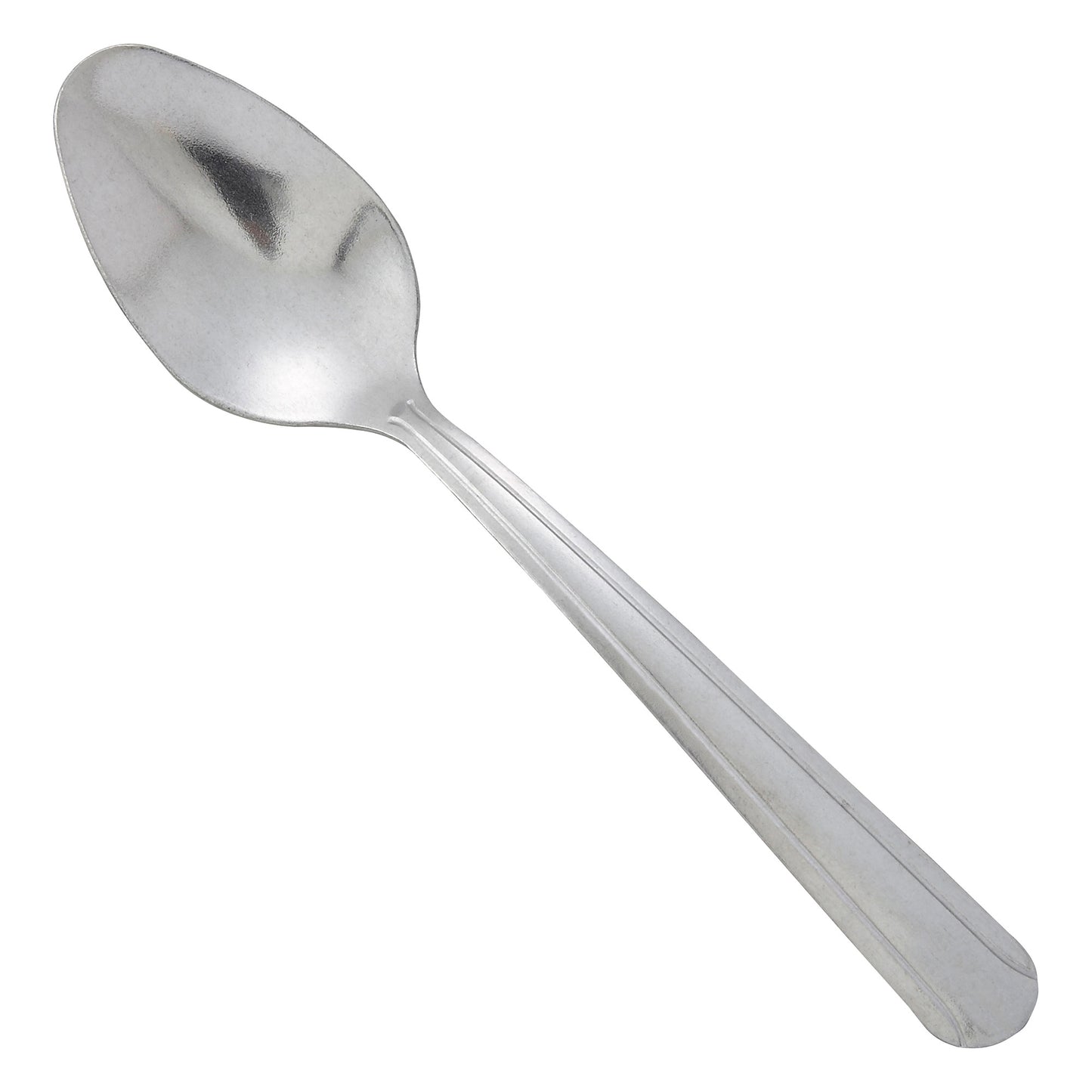 Create an elevated table setting with this commercial-grade 6.25" teaspoon, part of the Dominion flatware collection by Winco. This teaspoon features a small bowl making it ideal for tea or coffee service. The Dominion pattern features an art deco design with two lines down the length of the handle for a sophisticated addition to any tabletop. Forged from stainless steel, this medium weight teaspoon is designed to withstand daily use in a commercial foodservice environment making it an ideal choice for hotels, cafes and restaurants. Each piece of the Dominion flatware collection is dishwasher safe for both residential and commercial dishwashers. The elegant mirror finish is designed to last and is resistant to pitting or dulling, even after repeated washes.