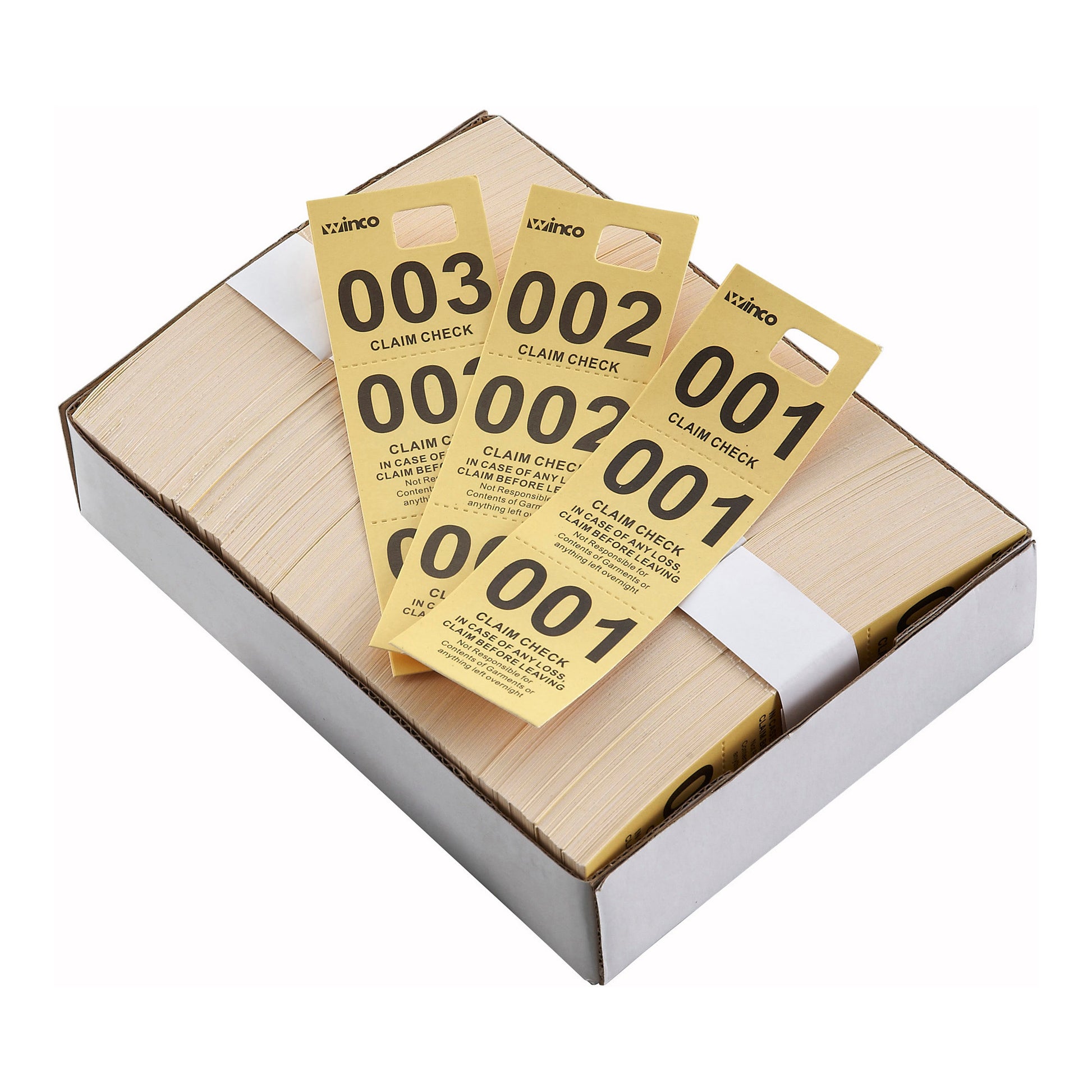 - The Winco CCK-5WT coat check tickets feature 3 identical parts ideal for checking coats and luggage in hotels, restaurants and convention centers. The perforated design ensures quick, clean separation without tearing. The large numbers and bright colors help speed up identification ideal for busy establishments. 500 pieces / box.