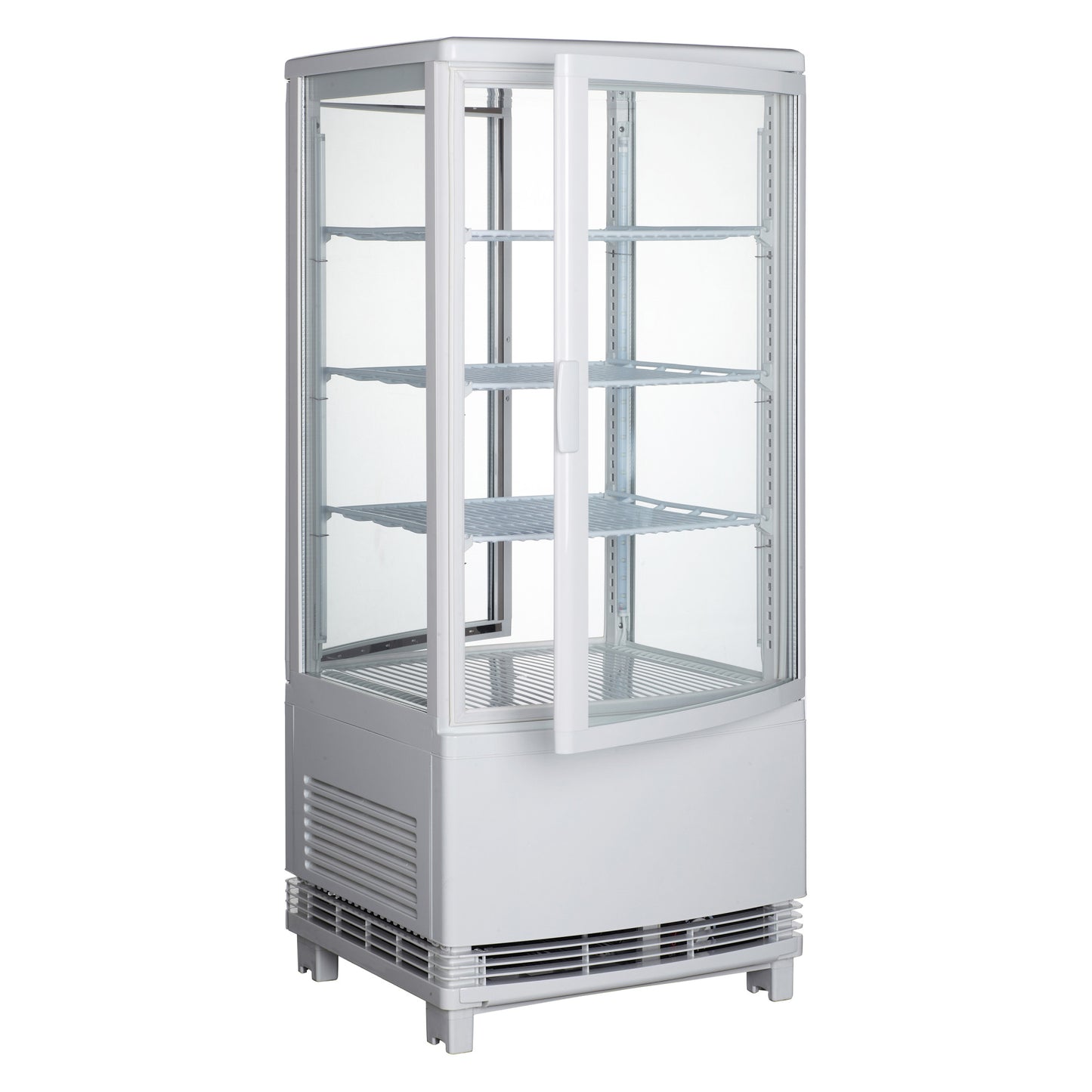 2 double, curved-glass doors for dual access and easy placement of inner contents