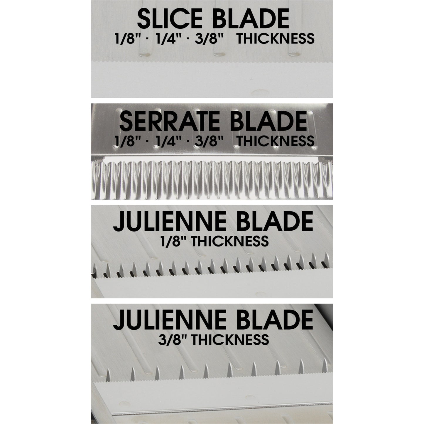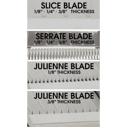 - Three (3) built-in blade styles, each with multiple thicknesses: Straight slice (1/8", 1/4", 3/8"), Serrated / Wavy (1/8", 1/4", 3/8"), and Julienne (1/8", 3/8")