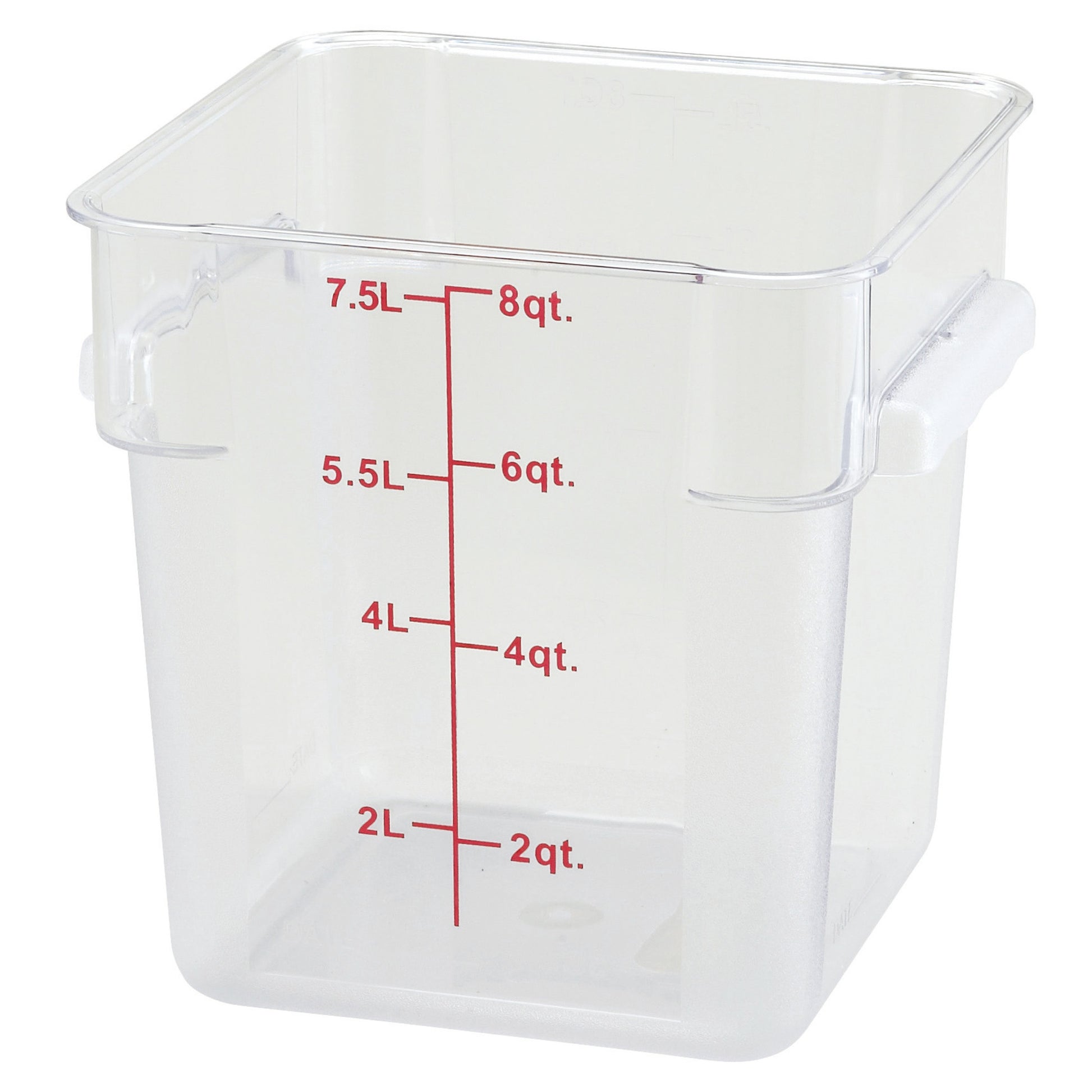 Material Polycarbonate Color Clear Capacity 8.0 qt 7.57 l Length 10.25 in 26.04 cm Width 8.75 in 22.23 cm Height 9.0 in 22.86 cm -